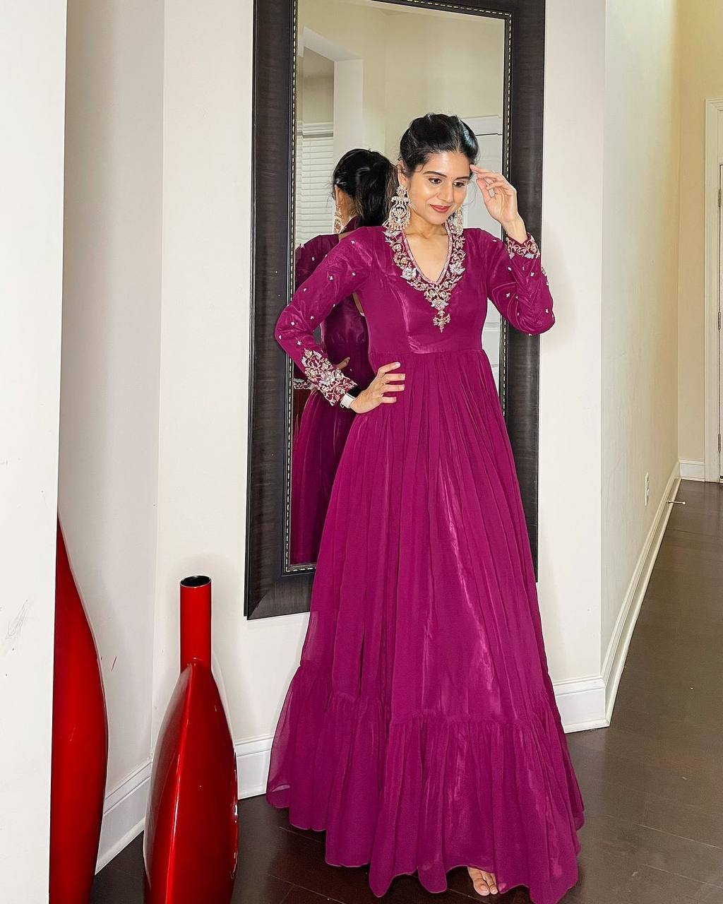 GOWN- SOFT HEAVY CHINON SILK FABRICS AND EMBROIDERY WORK ON YOKE & FRILL WORK GOWN