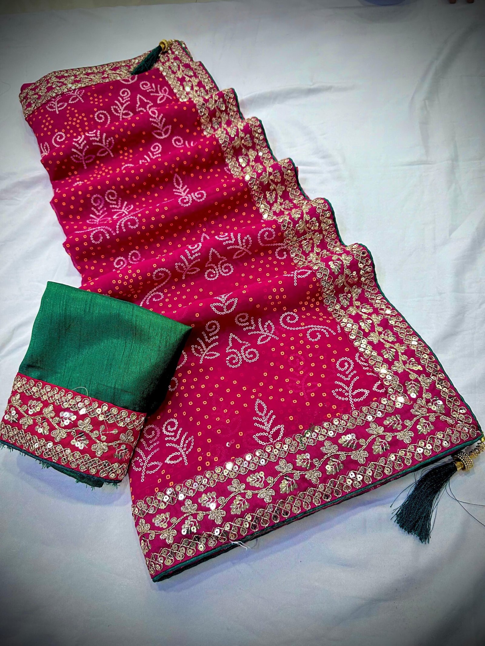 Fabric:- Heavy Georgette Bandhej Saree With Beautiful Print and  Sequence work Lace border 9 Miter