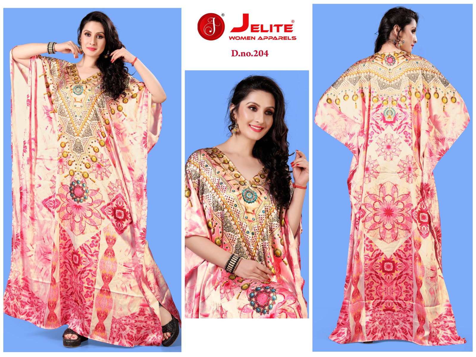 Weaved in supreme quality Japan Satin fabric, these kaftans have extraordinary lustrous, opaque and soft texture. Its beautiful silhouette and great fall is enhanced by the export level digital printing on it and is available in unique designs with stone work. With a length of 58 inches and a drawstring at the waist, it empowers you to customize it to fit you perfectly. This season, grab this absolute comfortable wear and stay versatile.