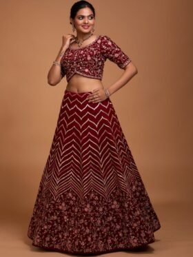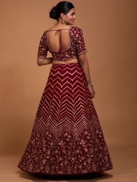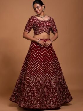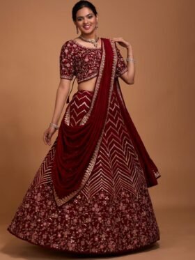 Lehenga Choli- Maroon Satin Lehenga Choli Set with Georgette Dupatta
