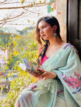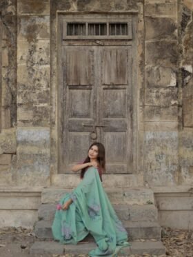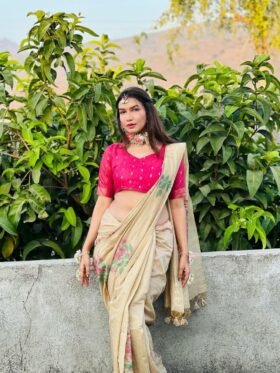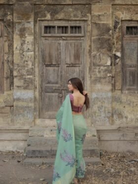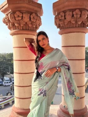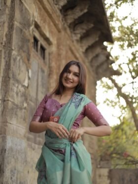 Saree- Premium soft muga silk Fabrics And Unique Floral Print And Small Zari Patta On Pallu Saree