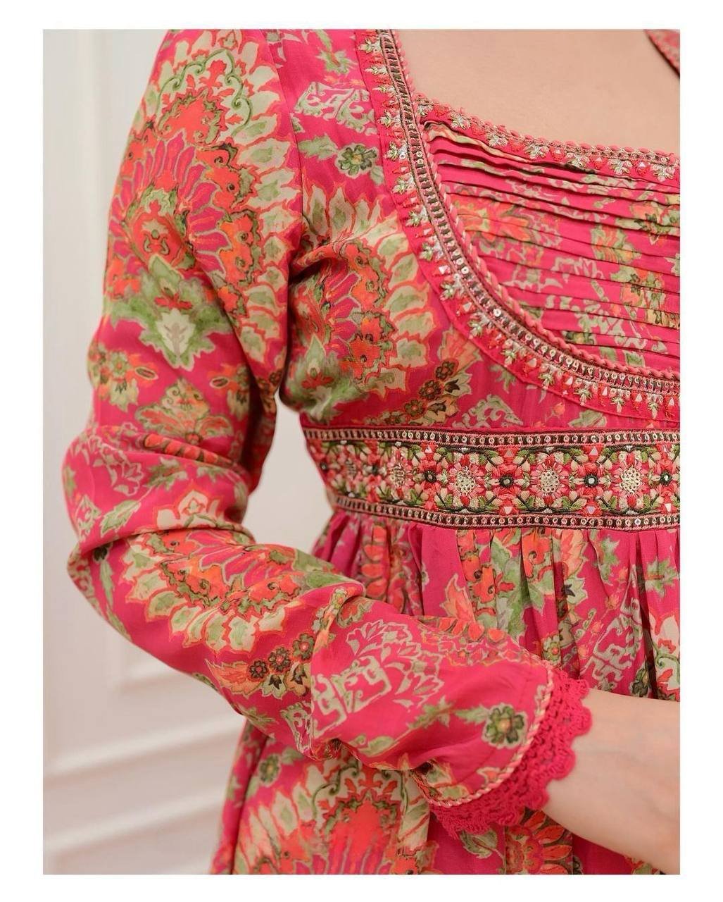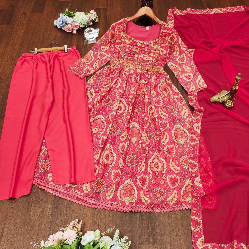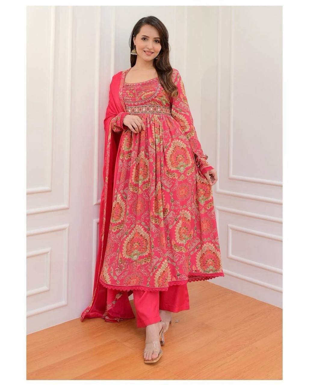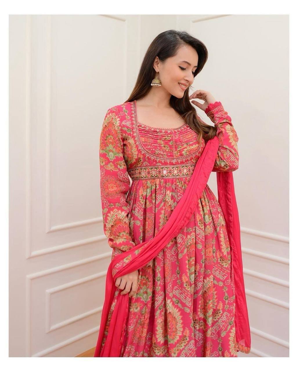 This elegant Anarkali Kurti  features a beautiful Georgette print, paired with a printed pant and a Nazneen dupatta with embroidered lace detailing. The gown showcases vibrant multi-print patterns, making it the perfect choice for small gatherings or functions. With full lining and a comfortable fit, it’s both stylish and easy to wear!.