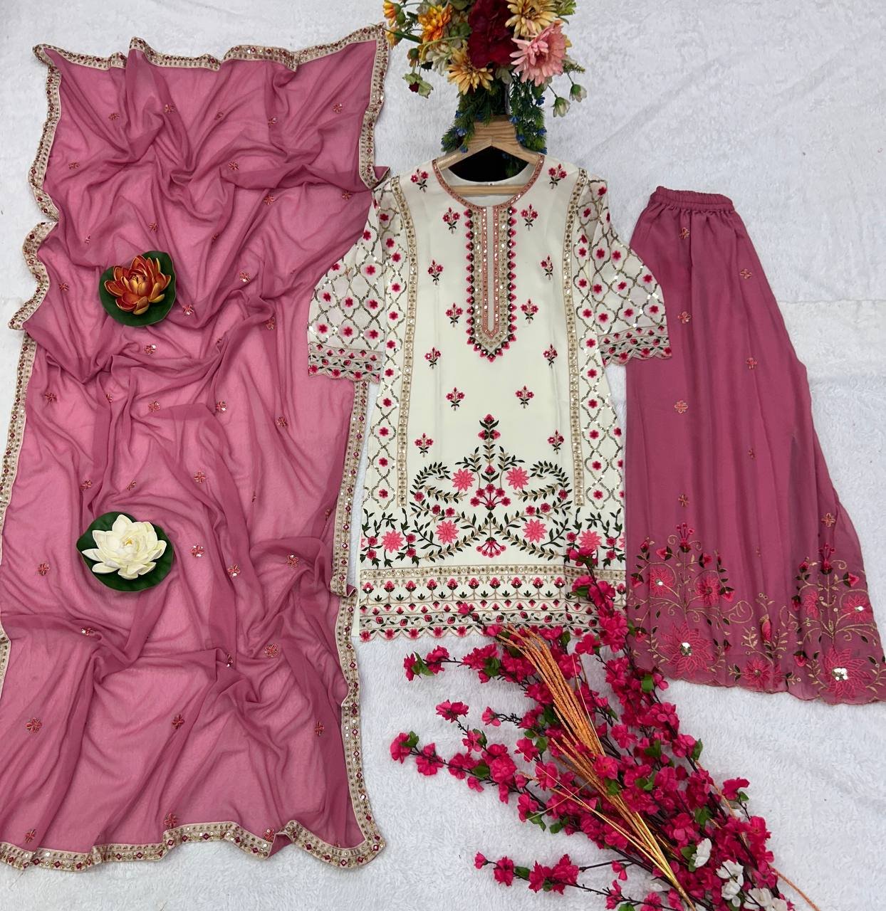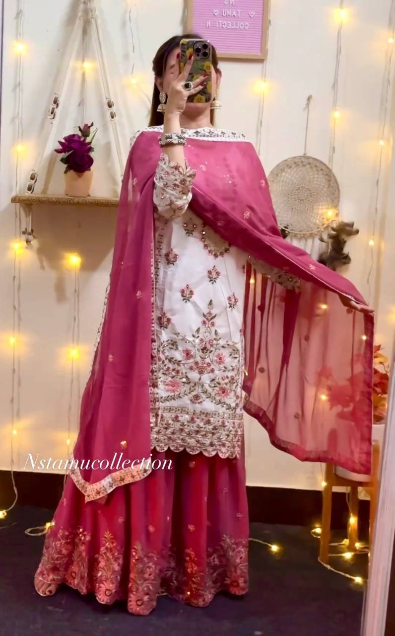 Kurti And Plazzo With Dupatta-Heavy Faux Georgette Silk Fabrics And Multi Needle Embroidery Work Kurti and Plazzo Dupatta