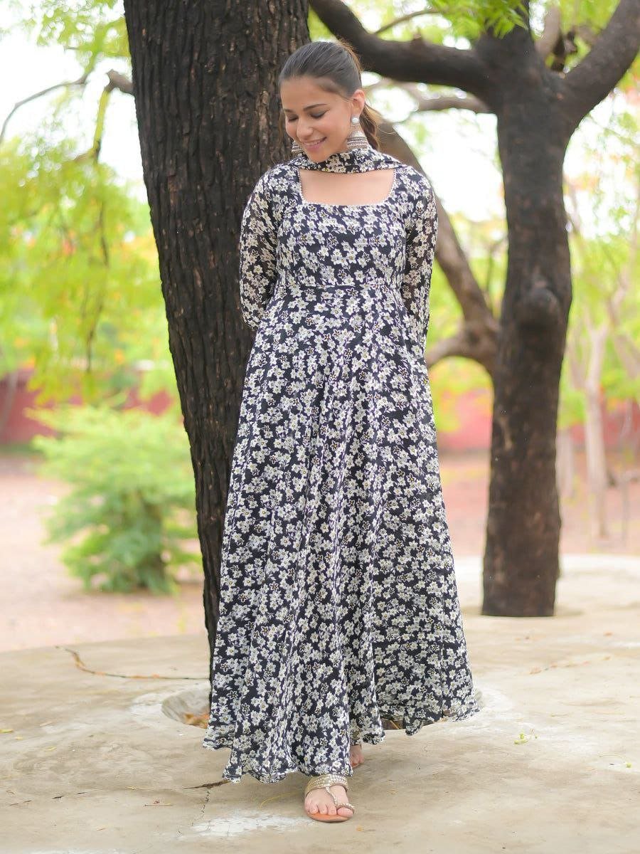 Classic Dress Are Delightful And This Easy To Wear And Stylish Black and white flower Print fox Georgette Suit With Beautiful Lace details on dupptta and Overall Digitally crafted dress Is A Joyful Vibe.