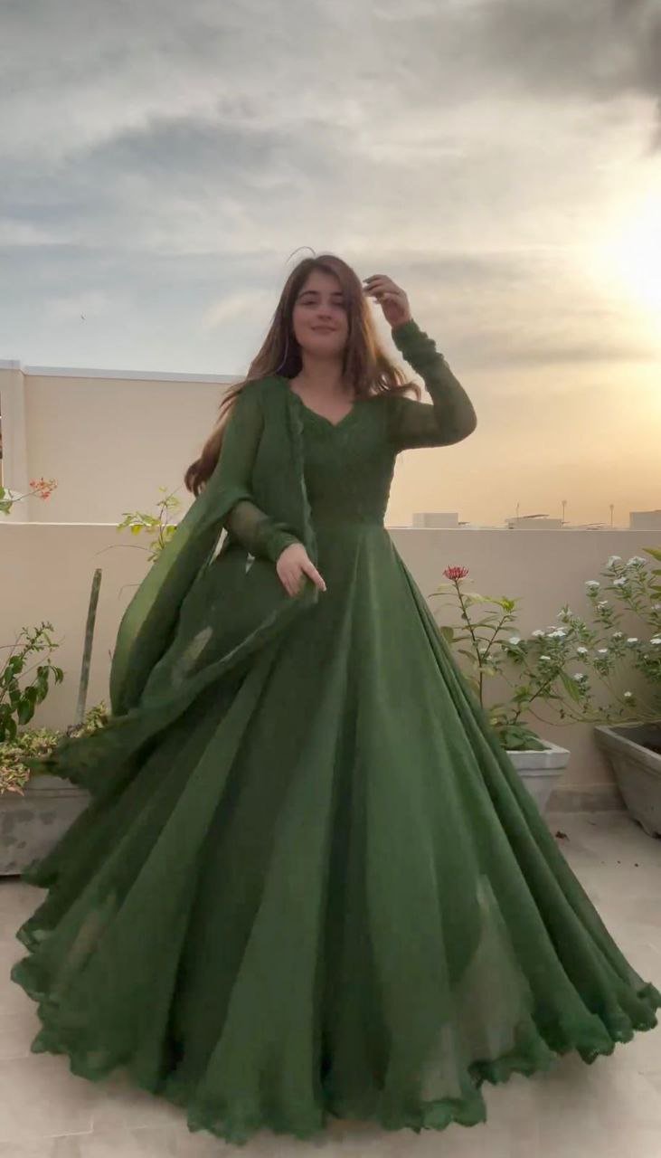 Looking for this same colour beautiful Designer Gown on Faux Georgette febric with Inner and Lace work and Dupatta on also Faux Georgette febric with lace work.