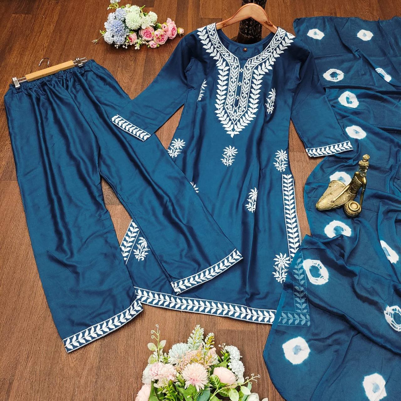 This premium Rayon cotton Kurti features exquisite chikankari embroidery , paired with matching Rayon pants and a delicate Nazneen dupatta. The perfect blend of tradition and comfort