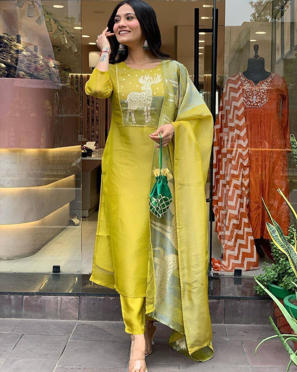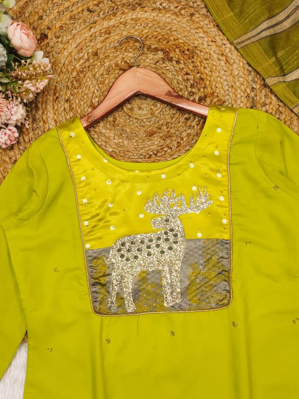 Kurti- Kurti With Beautiful print And Work Silk Pant And Embroidery Work Lace Dupatta