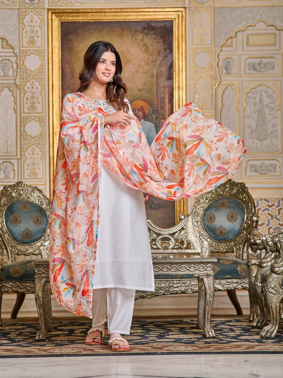 Kurti Pant And Dupatta Set-Chnaderi Fabrics And Heavy Embroidery Work Kurti With Tabby Fabrics Dupatta