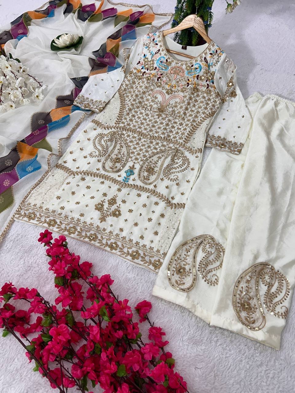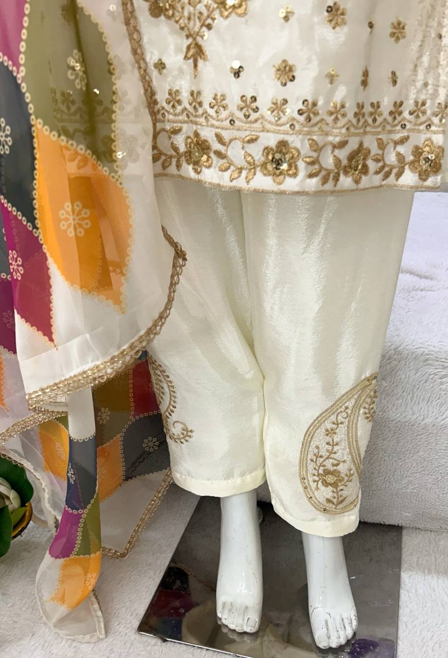 Kurti Pant And Dupatta Set-Heavy Pure Chinon Silk Fabric And Sequins Embroidery work.