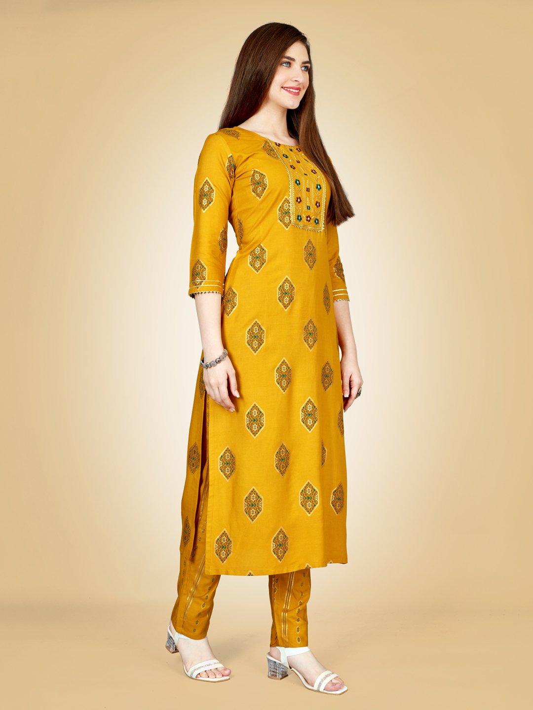 Kurti Pant Set – Heavy Rayon Fabrics Embroidery Work Kurti Pant Set