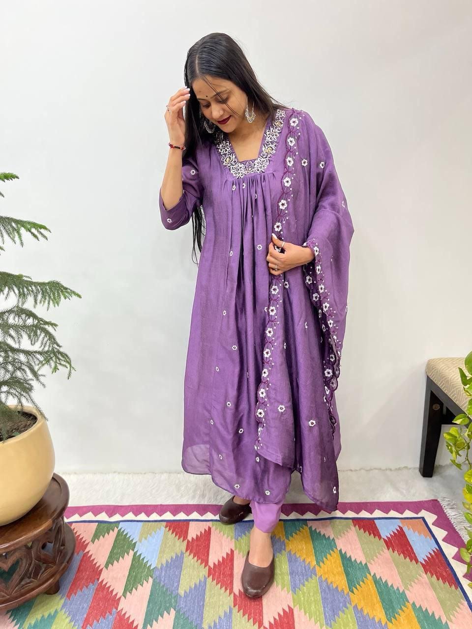 Presenting By New Party Wear L@@K Vichitra Silk A line Gown P@nt With Dupatta Set of 3 pic