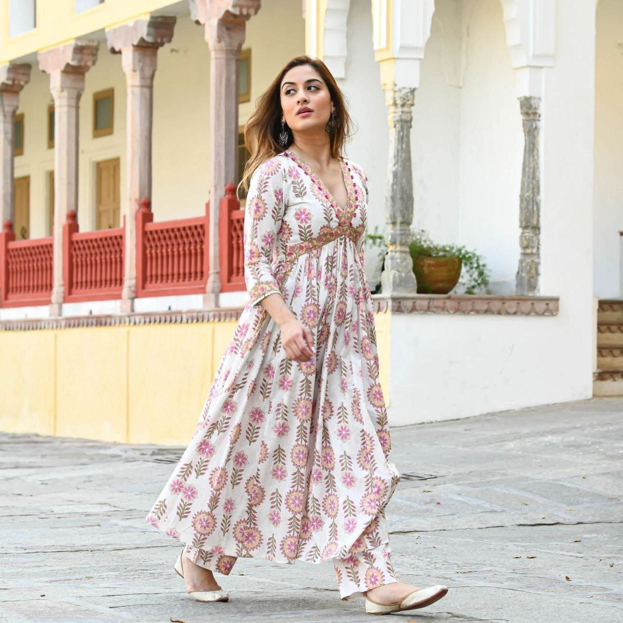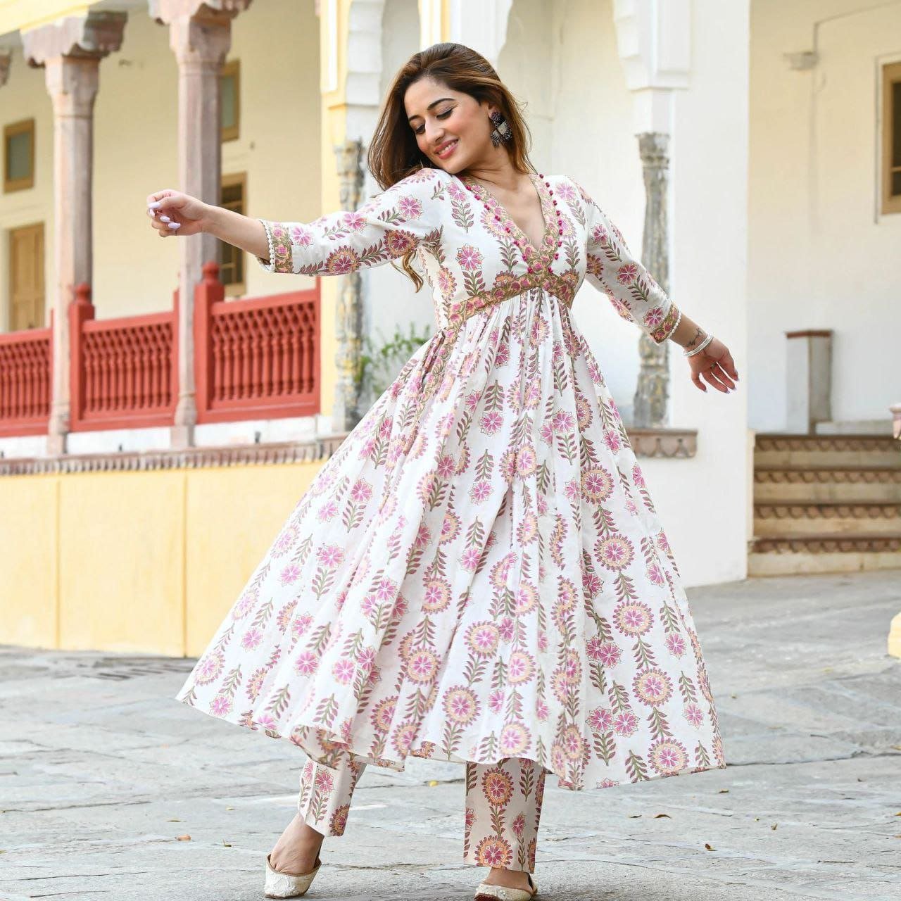These Beauties Have Our Heart There Are So Fresh Looking Floral Anarkali A Perfect Outfits To Look Elegant And Simple The Neck Has Alia Cut With Unique Details To Add Charm For The Finish Touch At Neckline The Lace Is Added for Finish Touch.