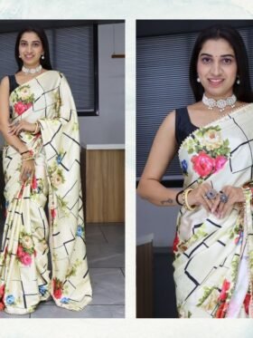 SAREE-Heavy Japan Satin Fabrics And Geomatric Chex Printed With Moti Lace Pearl Lace saree♠️