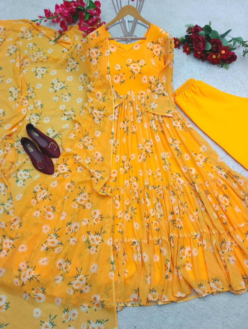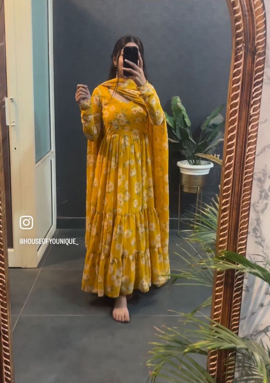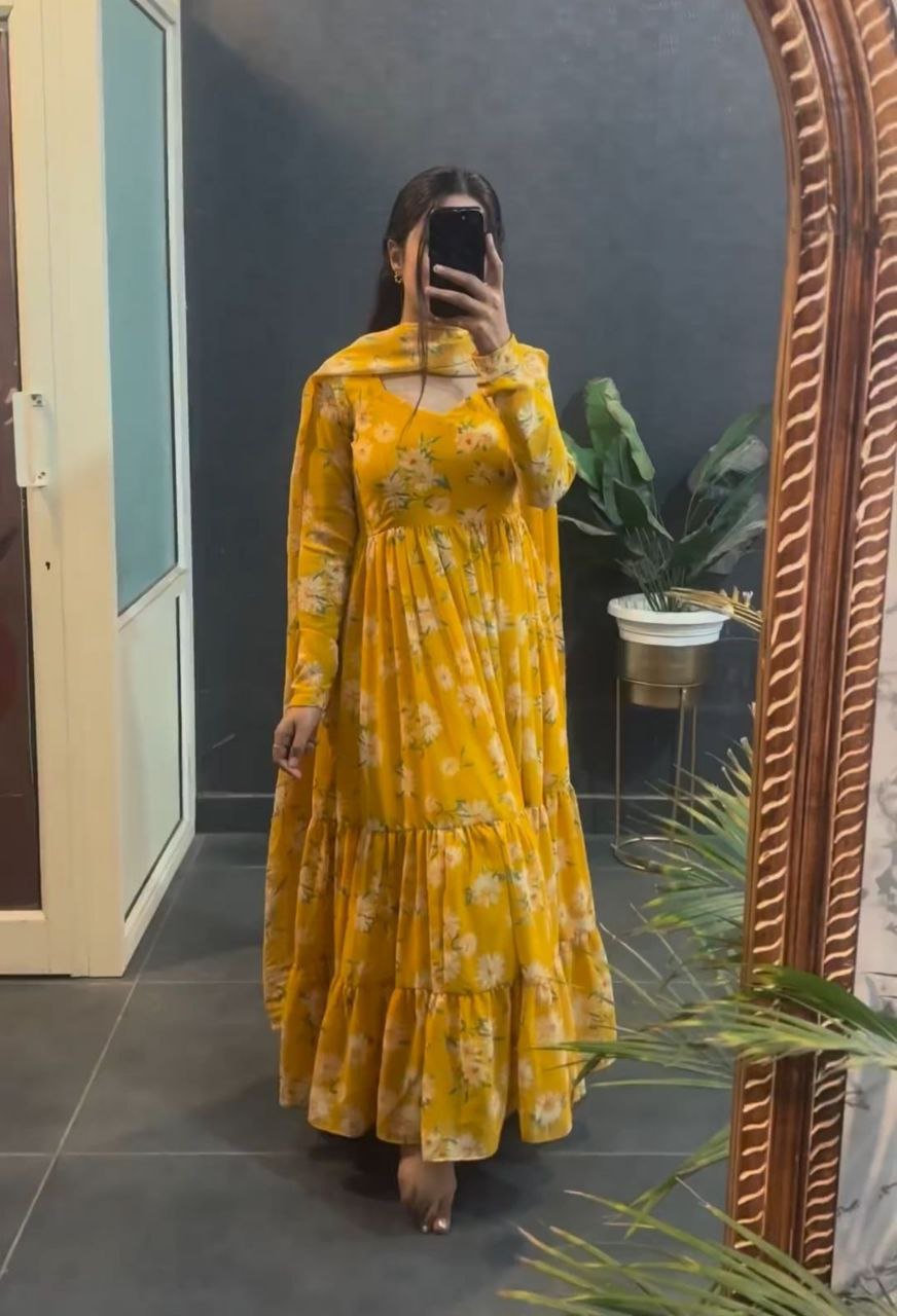 *Gwon Fabric* : Heavy Fox Georgette With Dijital Print Work With Ruffles With Full-Sleeve