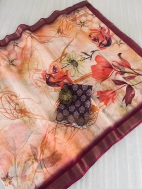 SAREE- Linen With Gold Jari Border And Digital Prints Saree