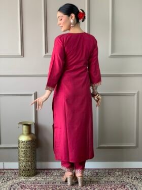 Kurti With Pant & Dupatta Set-Silk Fabrics And Embroidery Work Kurti
