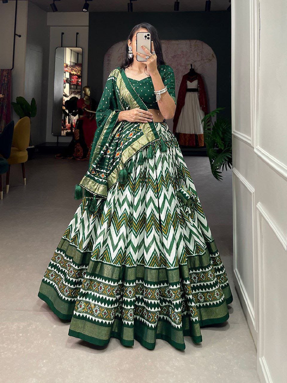 Lehenga Choli- Dola Silk Fabrics With Patola Print and foil work belt Lehenga
