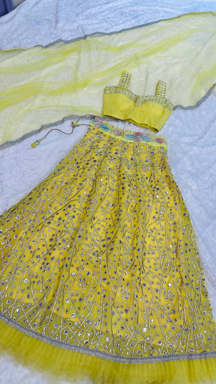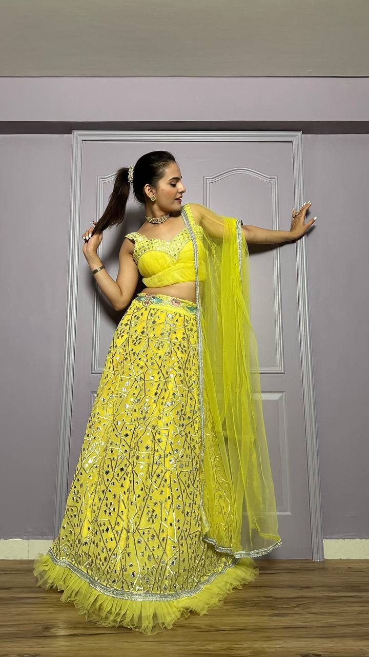 Georgette lehenga with zari & foil paper work + net ruffle border