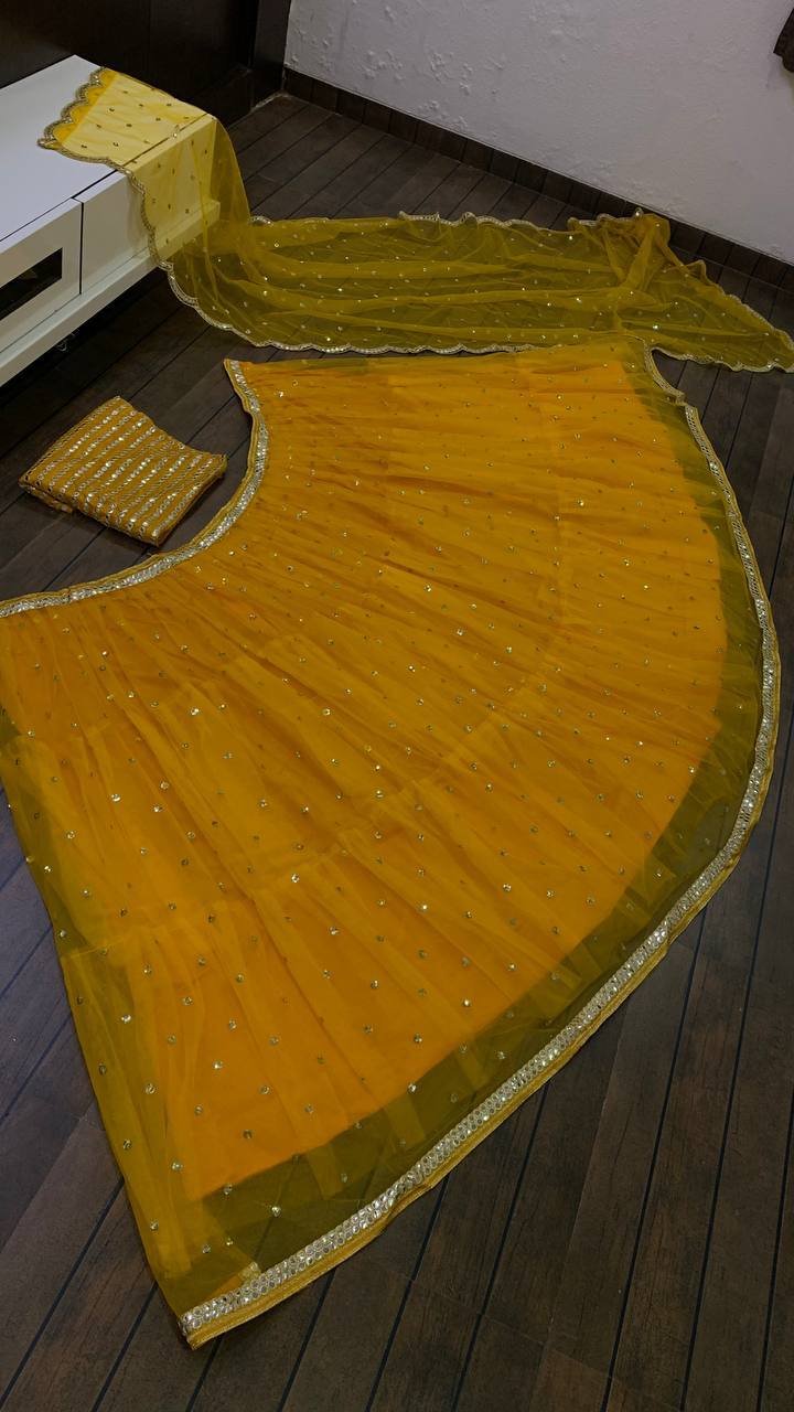Lehenga Choli- Two layer ruffle net lehnga with sequence & paper mirror work And Net Duppata with sequence & foil mirror border work