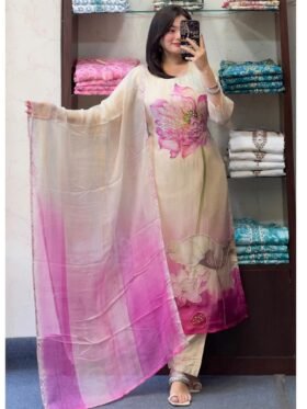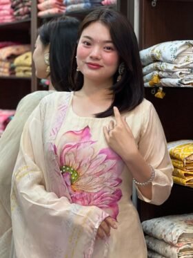 Kurti Pant And Dupatta- Beautiful Heavy quality Muslin Silk Fabric designer kurti pant and duppta with hand work and moti work with lining