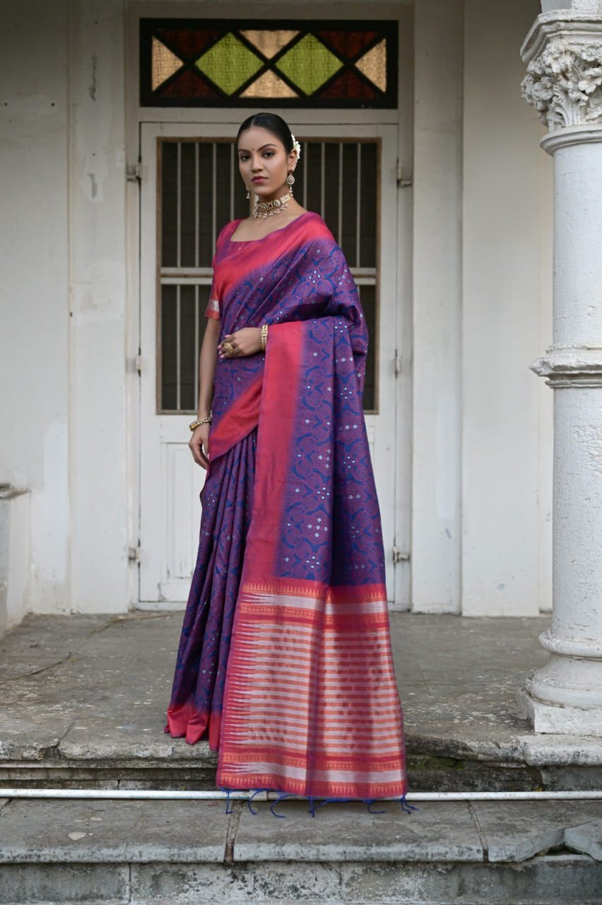 Banglori handloom raw silk saree with contrast temple weaving border and all over traditional bandhani weaving pattern and rich zari pallu with contrast blouse piece