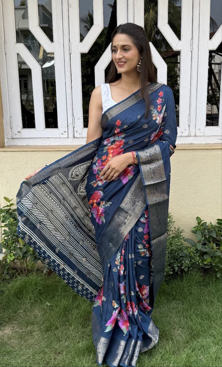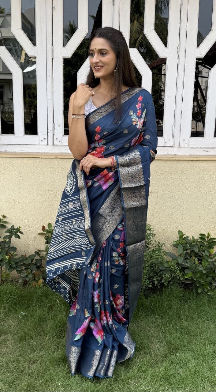 Saree-Dola Silk Saree Colour-Dark Blue With Floral Prints