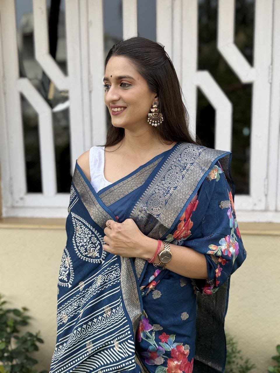 Save 29%Saree-Dola Silk Saree Colour-Dark Blue With Floral Prints