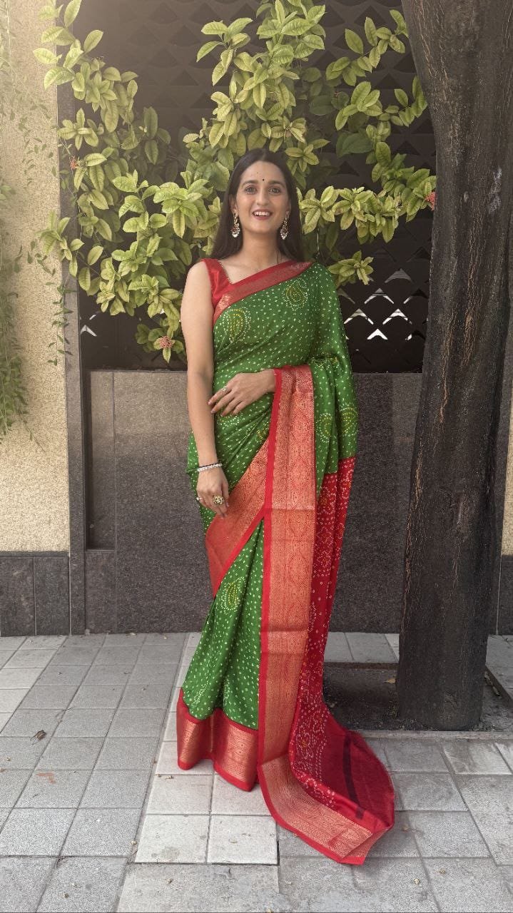 Saree-Marsh Mellon Silk Saree And Jaquard Boder With Foil Print-Colour-Green And Red