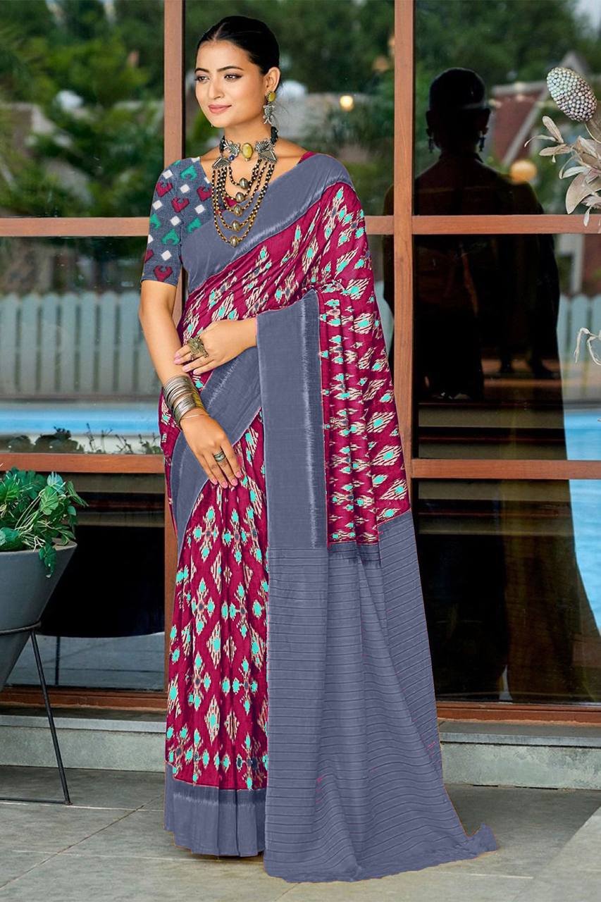 SAREE- PURE COTTON FANCY IKAAT PRINT SAREES WITH BLOUSE PICE Colour- Gray And Pink