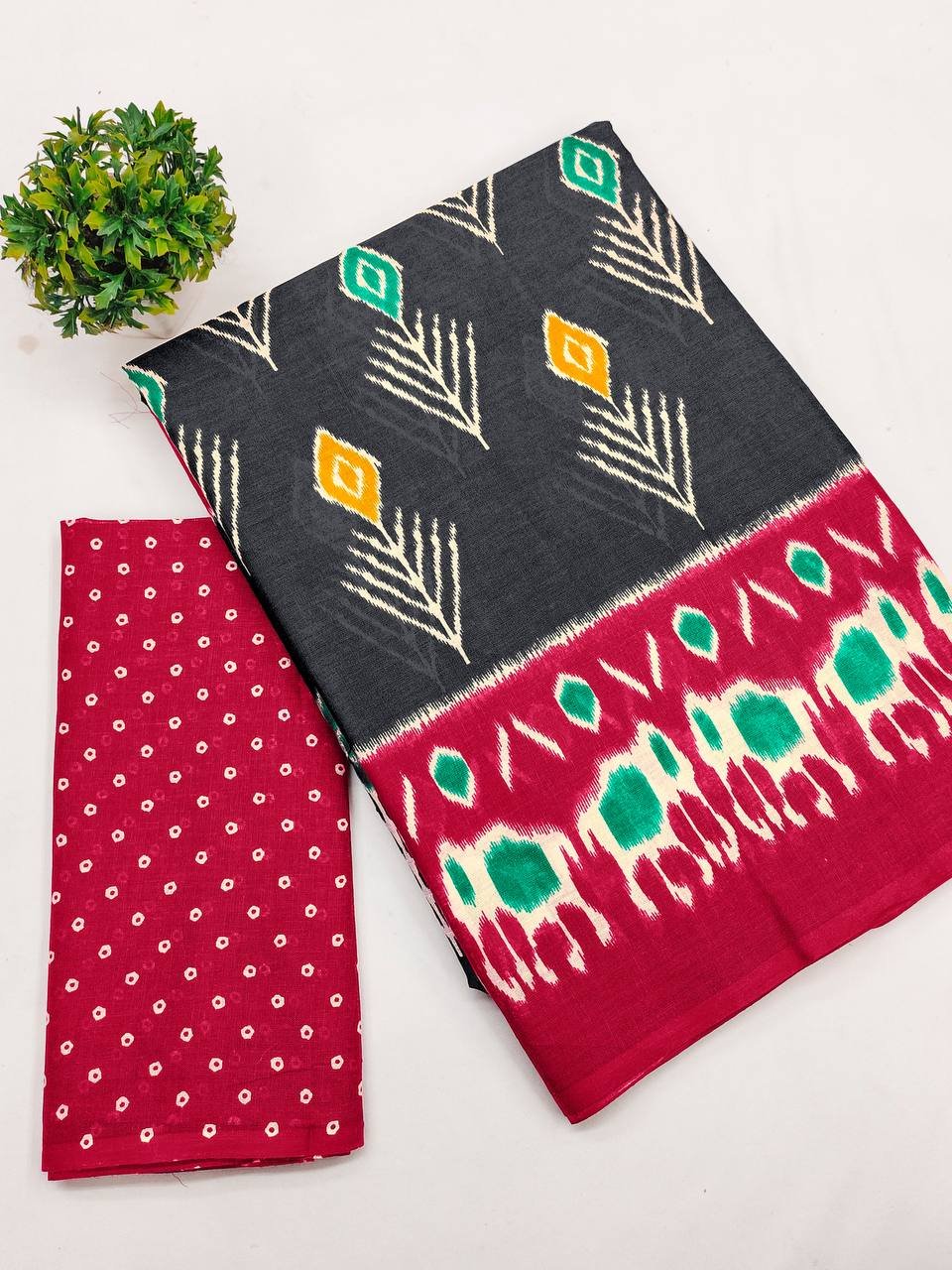SAREES : 6.30 MTR PURE COTTON FANCY IKAAT PRINT SAREES WITH BLOUSE PICE