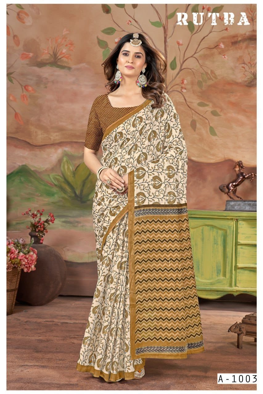 SAREE- PURE COTTON HAND BLOCK PRINT SAREES-COLOUR-WHITE AND BROWN