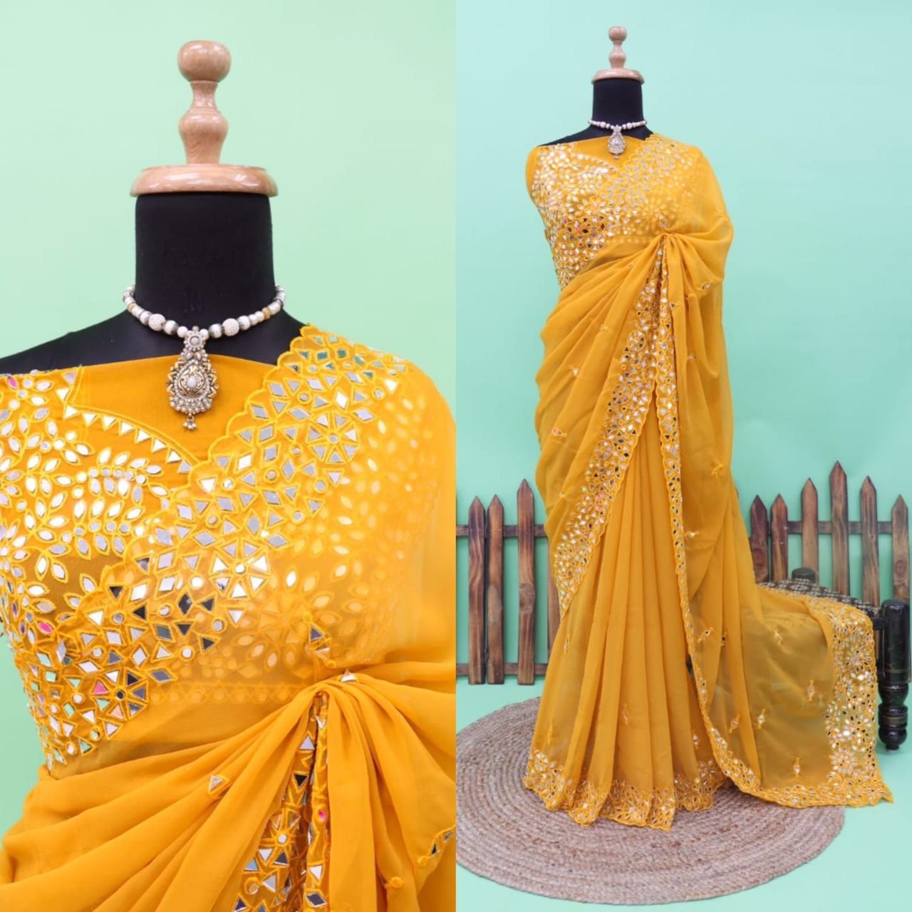 SAREE- SOFT HEAVY GEORGETTE FABRIC ON BEAUTIFUL EMBRODIERY C-PALLU THREAD WITH 4000+ REAL MIRROR WORK ON SAREE-COLOUR-YELLOW