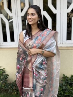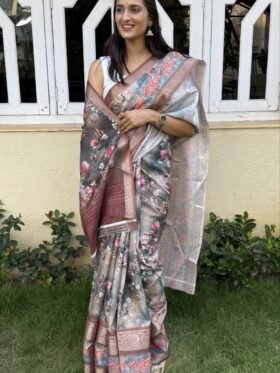 SAREE-CANDY SILK JARI CHEX MATERIAL AND JAQUARD BORDER WITH PRINTED SAREE-COLOUR-GRAY WITH FLORAL PRINTS