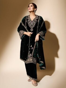Kurti Pant And Dupatta-Pure Viscose Velvet Fabrics And Sequins With Zari Embroidery work Kurti